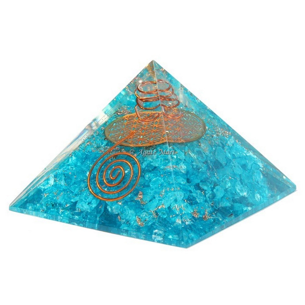 Aquamarine With Flower Of Life Orgonite Pyramids pyramid helps to filter and balance energy fields in our environment and aid strengthening your body by converting the low frequency into higher frequency energy that is more beneficial for life forms including yourself, pets and plants.