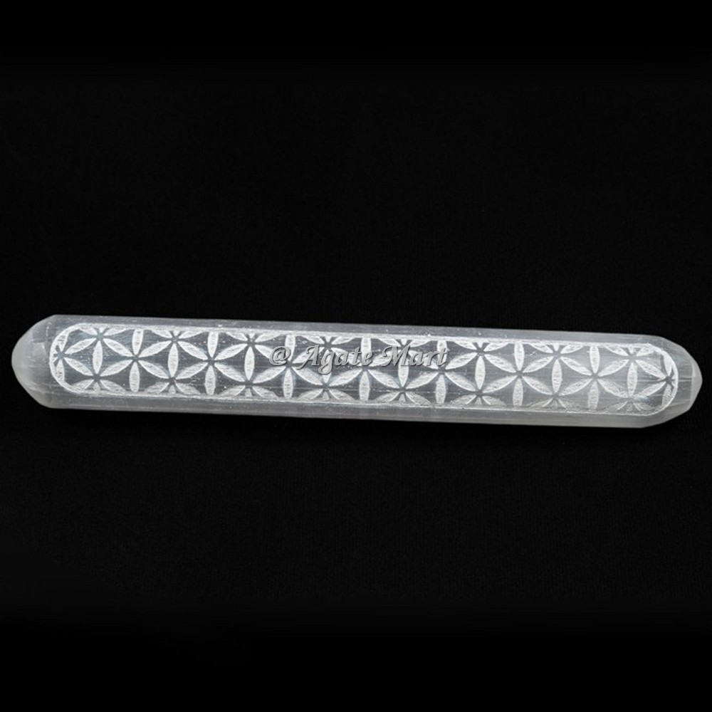 Huge and attractive collection of Flower Of Life Selenite Healing Wands at affordable price only at Agate Mart. Using a selenite wand during meditation will assist the flow of white light energy and help attune your energy to your highest self. Simply hold a selenite wand in one or both hands, whichever is most comfortable for you, and visualize its high frequency radiating white protective light to surround you. The meaning behind the Flower of Life symbol is that it is accepted to speak to the cycle of creation. What`s more, Flower of life is giving the internal quality in body. It portrays how all life comes from one singular source - represented by the circle in the middle of the pattern. It is said to hold the most significant and sacred patterns of the universe. Order online as soon as possible.