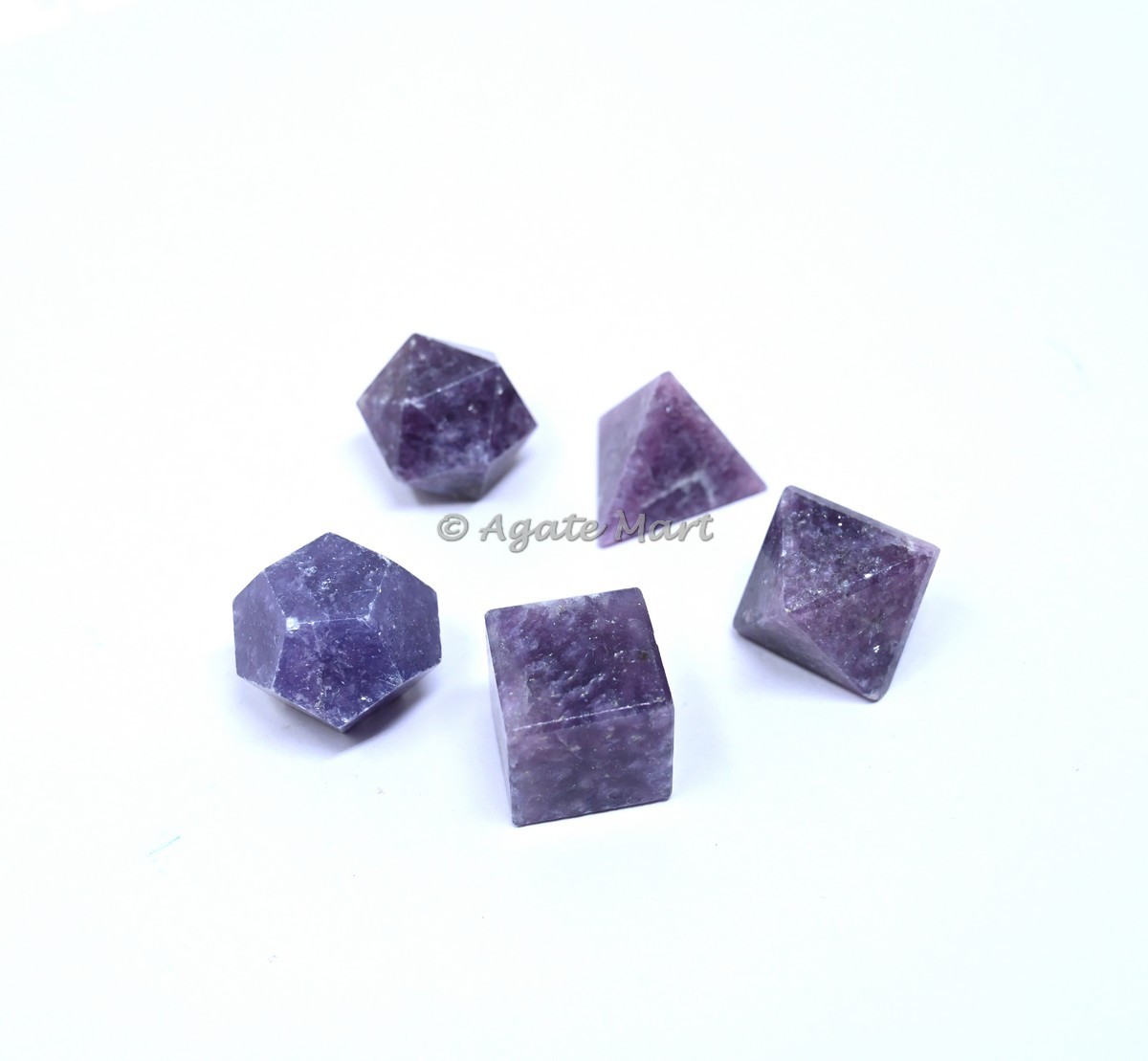 We are the supplier of healing crystals and we supply our customers best quality product. We have a collection of sacred 5pcs geometry set you can see our collection by visiting our website www.agatemart.com. Now let you get A detailed description about Lepidolite, Lepidolite is sometimes called the "peace stone" or "grandmother stone" because it is thought to have nurturing and calming properties. Within the metaphysical realm, lepidolite aids in overcoming emotional or mental dependency and helps treat addictions and all kinds conditions, including anorexia. We are sure that you will not get dissapointed by buying our any products.
