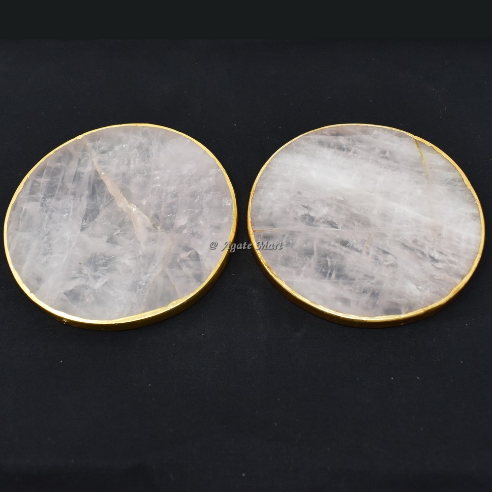 Agate Mart Supplier and wholesaler of healing crystals coasters. Rose Quartz Round Gold Plated Coaster
