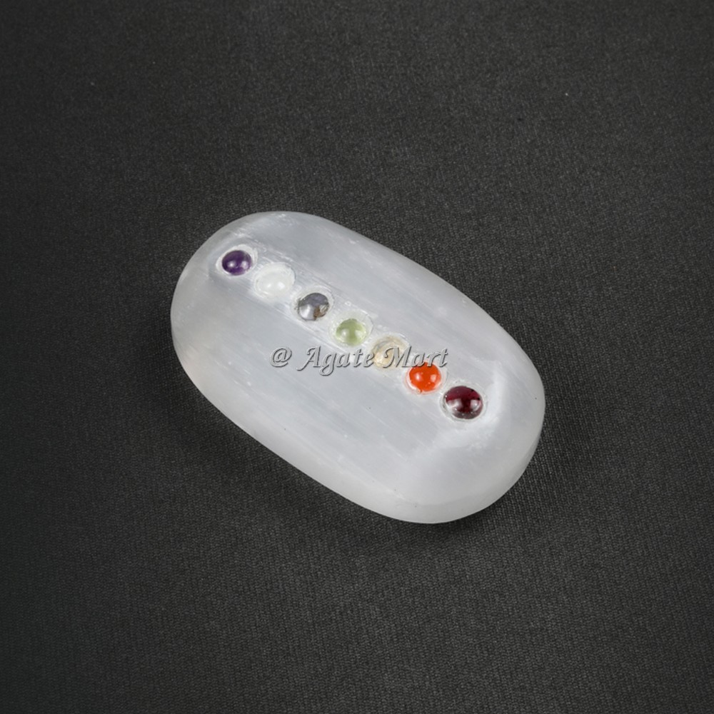 We offers the best collection of Seven Chakra Stones Selenite Palm Stone at Agate Mart. Selenite brings mental clarity, clearing confusion and revealing the bigger picture behind problems. A protective stone, Selenite shields a person or space from outside influences. Selenite can evoke protection from the angelic realm and also dispels negative energy. Selenite is a crystallized form of gypsum. 7 chakra stone improves intellect power, creativity and self-respect. It brings good luck to your life. Enhance the emotional and physical balance and remove the fear and anxiety. Order now!