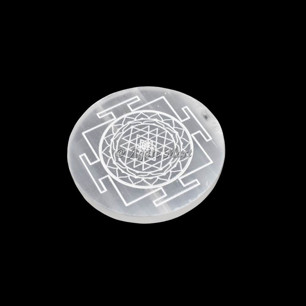 Shop for Selenite Sri yantra Charging Healing Disk from Agate Mart. The Shri Yantra, Sri Yantra, or Shri Chakra is a form of mystical diagram (yantra) used in the Shri Vidya school of Hinduism. It consists of nine interlocking triangles that surround a central point known as a bindu. These triangles represent the cosmos and the human body. Selenite is a crystallized form of Gypsum, which is used for good luck and protection. The powerful vibration of Selenite can clear, open, and activate the Crown and Higher Chakras and is excellent for all types of spiritual work. Selenite can also be used to strengthen the memory. These Selenite charging disks are beautiful with amazing energy.