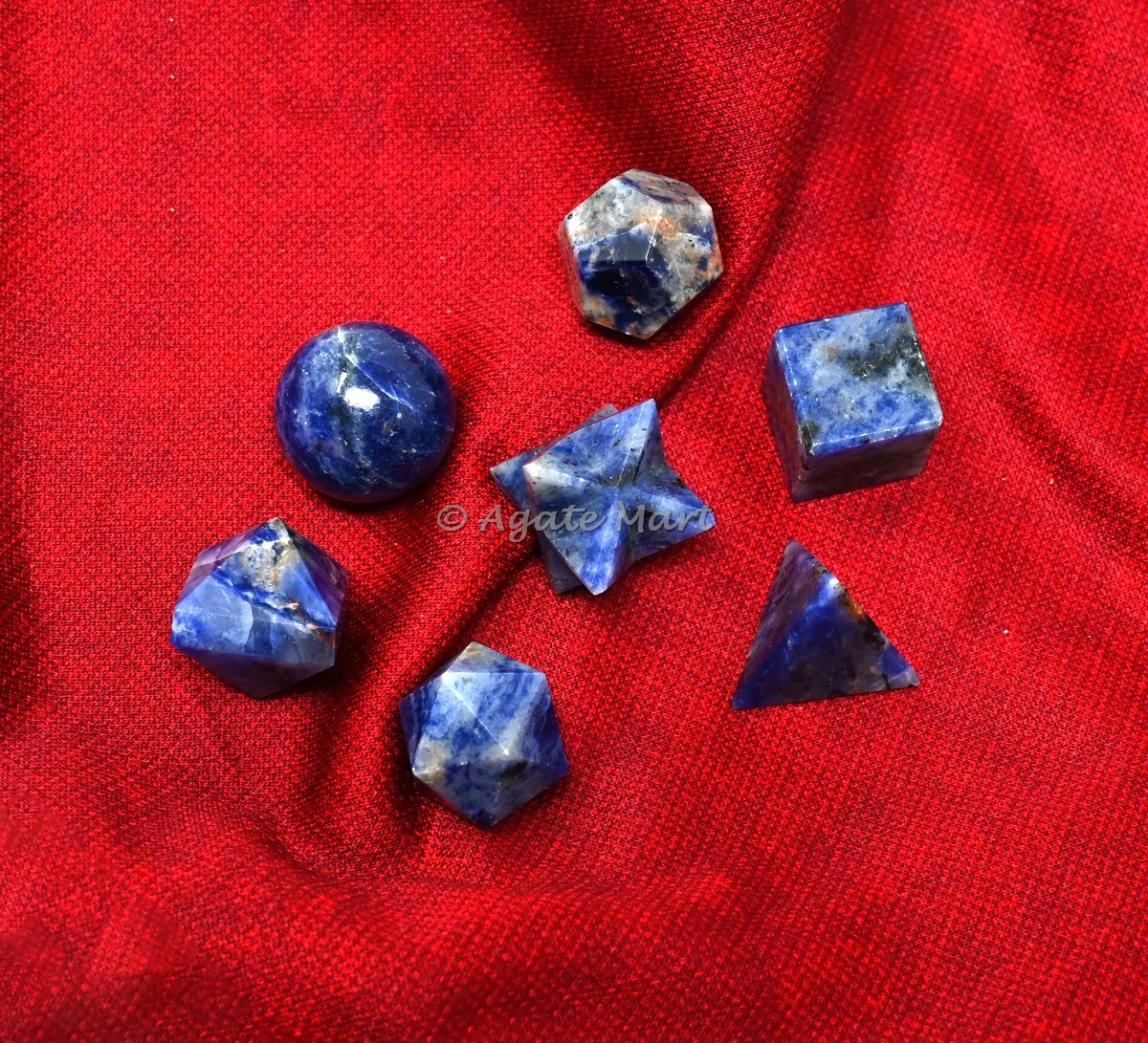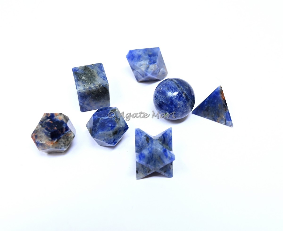 We are the supplier of healing crystals and we supply our customers best quality product. We have a collection of sacred 7pcs geometry set you can see our collection by visiting our website www.agatemart.com. Now let you get A detailed description about Sodalite It`s believed to have the ability to unite logic with intuition and the drive for truth with the rise of idealism. Practitioners have used sodalite to organize the mind, as it`s said to promote rational thought, objectivity and perception. It is sometimes thought to cleanse lymph nodes and boost the immune system. We are sure that you will not get dissapointed by buying our any products.