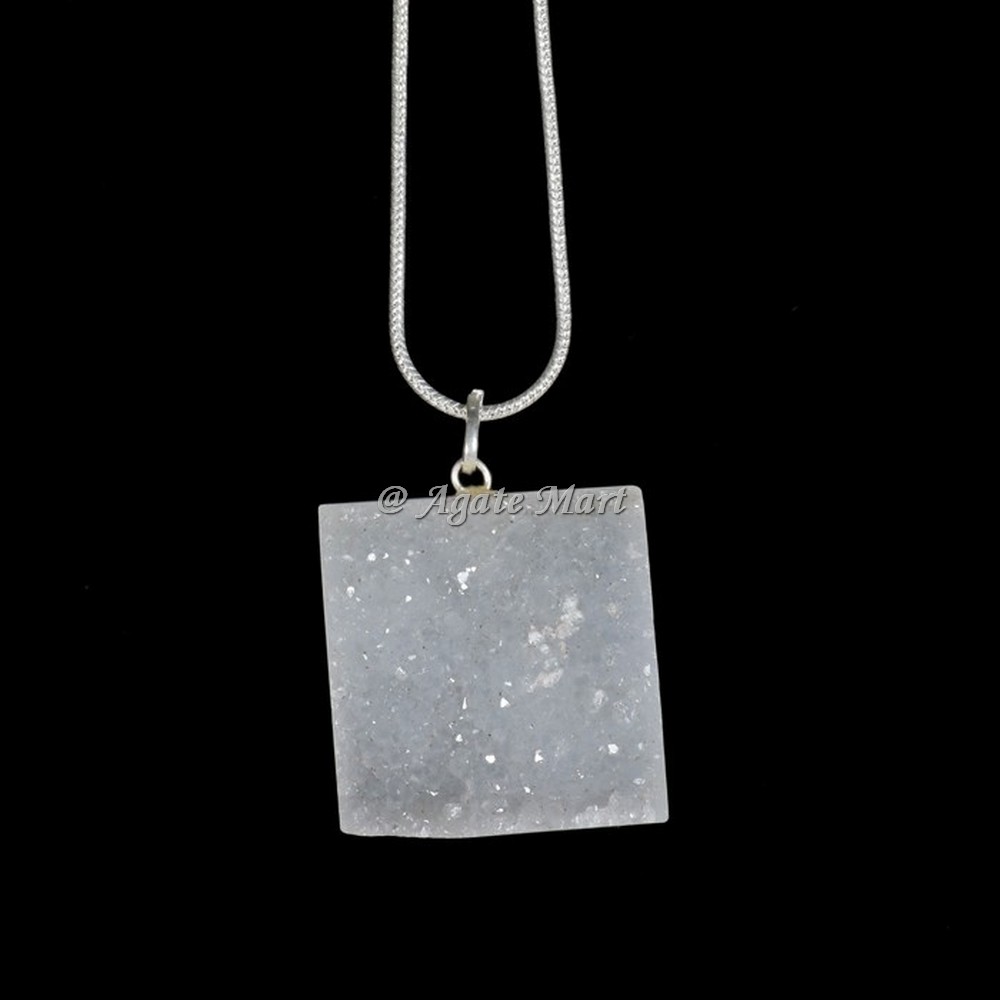 Exclusive collection of Square Shape Druzy Pendant - Agate Mart.It is also well-known as ?The Gemstone of Heaven.?Its meaning impact on the person`s body and mind helped one to get the most elevated wisdom. Most people believe that Druzy helps its user to calm down, thereby eliminating anxiety levels.Order Long Druzy with silver chain Pendant Now.