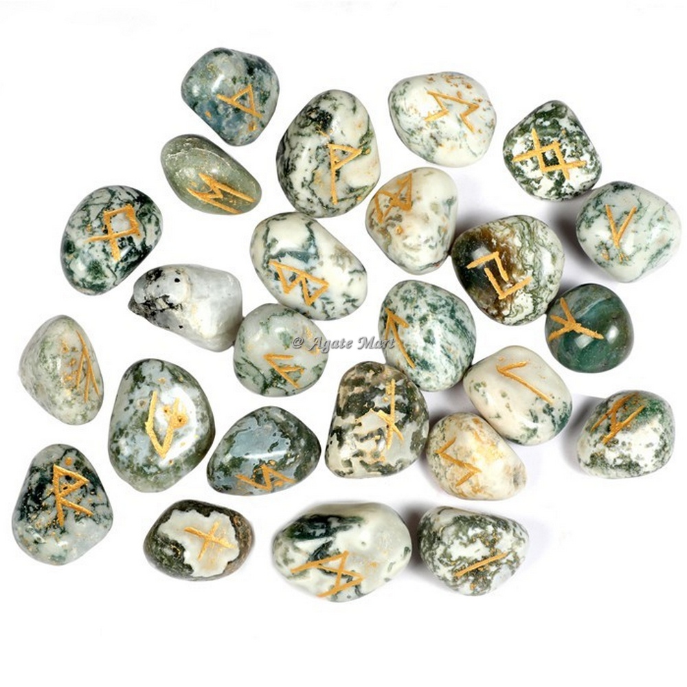 Tree Agate Rune sets are about connecting with your inner wisdom. Tree Agate Tumbles finely engraved lettering hand painted in gold with rune symbols. They can allow you to tune into your own thoughts helping you to find the answers in the runes that you already know in your subconscious. Order online now.